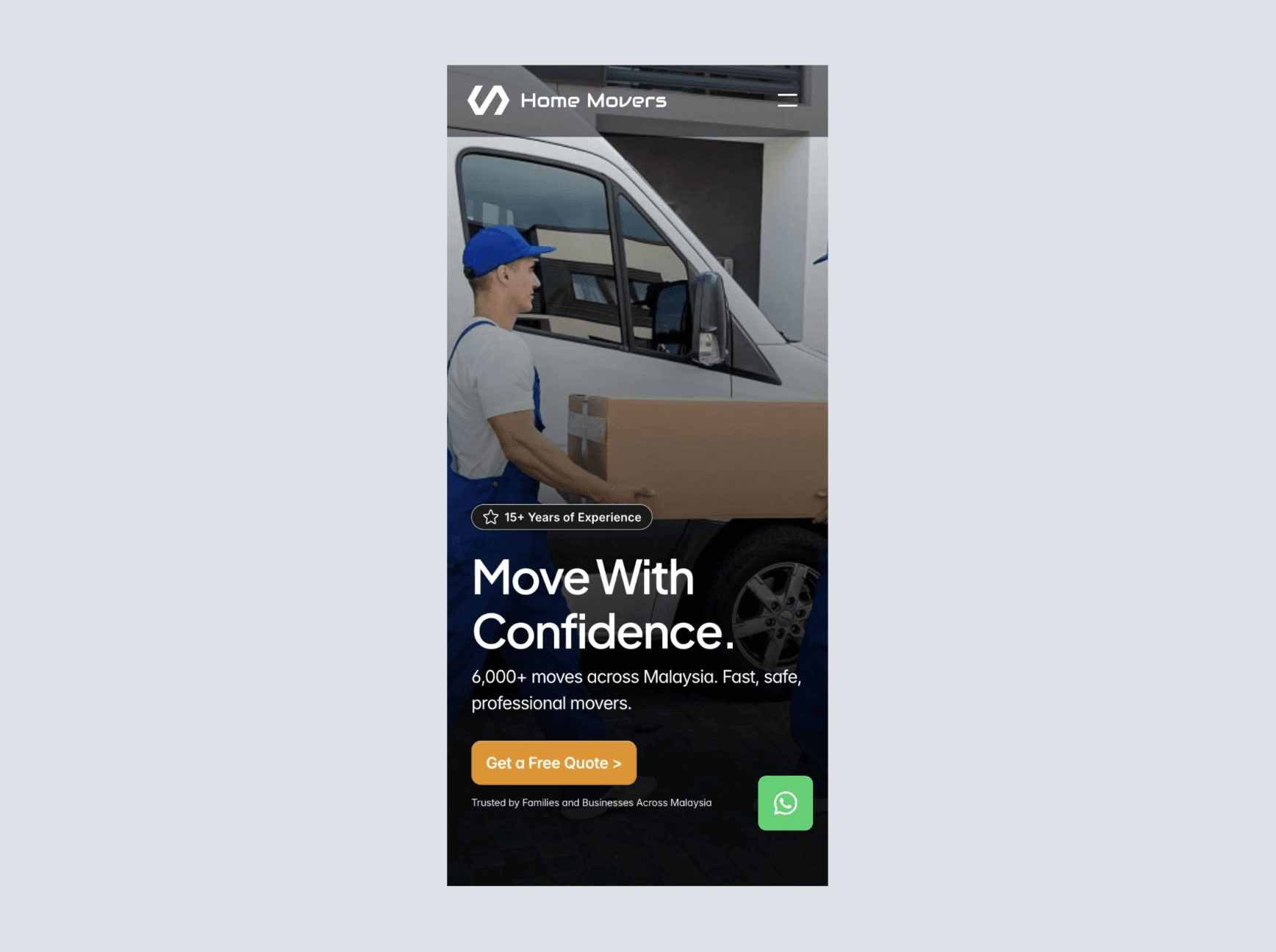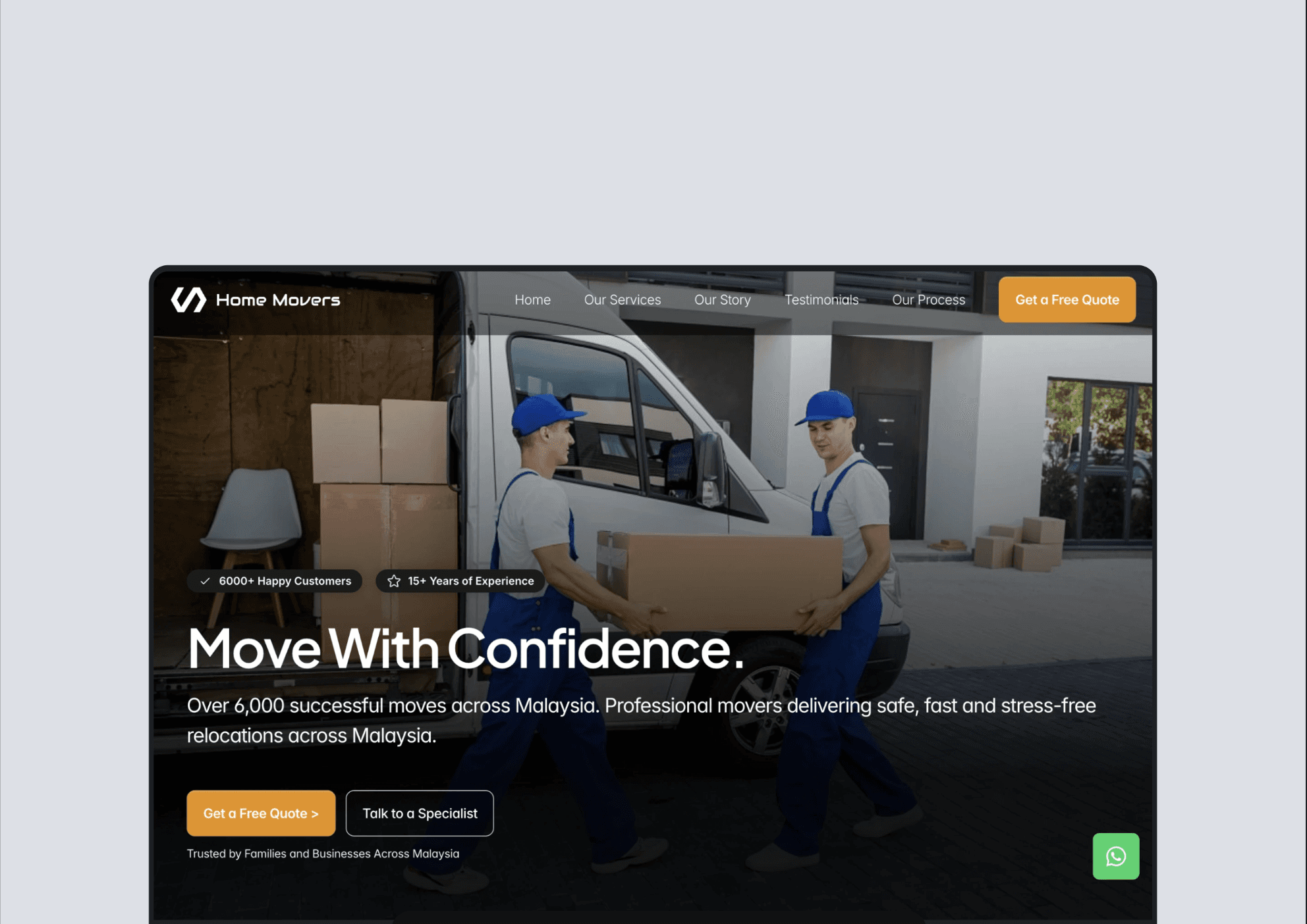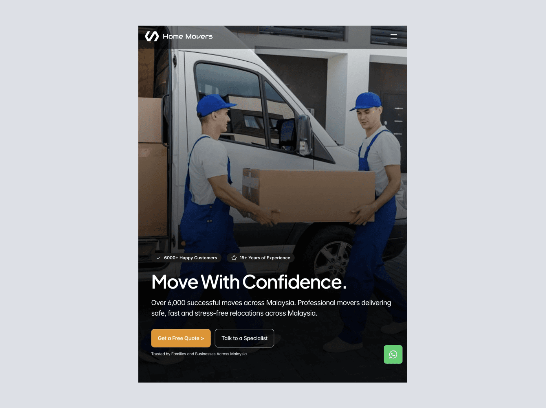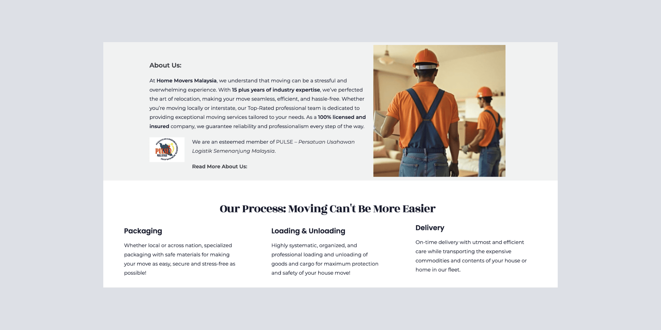 'About Us' section narrates the story of Home Movers and demostrates the years of experience and professionalism of the company. This section is made to build trust with the user through credibility and relatability.
